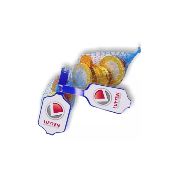 Netje gevuld met chocolade munten. Inhoud is 30 gram en bestaat uit de verschillende soorten Euromunten. De munten zijn gemaakt in melkchocolade van Callebaut. Het label wat aan het netje zit kunnen we personaliseren.