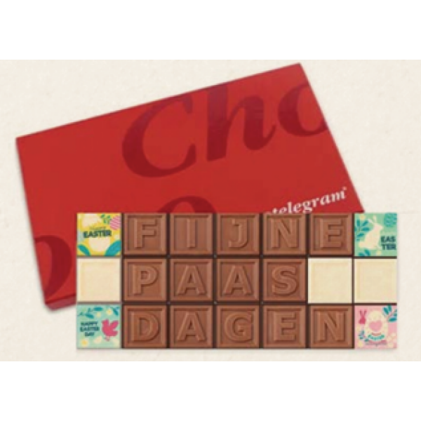 Een ChocoTelegram®21 met de tekst “FIJNE PAASDAGEN”. Let chocolate do the talking! Liever een eigen tekst in het ChocoTelegram®? Dat kan! Neem d…