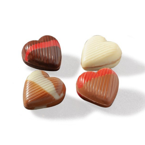 Topkwaliteit Belgische chocolade hartjes gevuld met een hazelnootpraliné, melk, puur en witte chocolade Standaard doosje in de rode kleur.