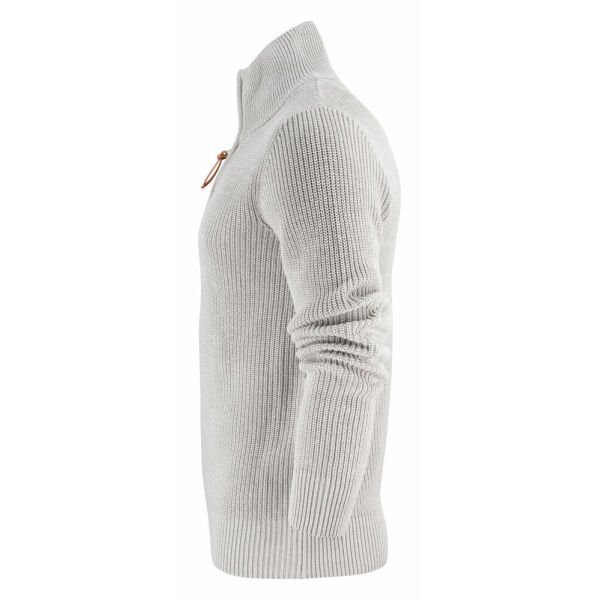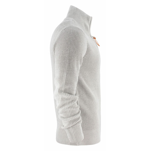 Zwaar gebreide vest met korte ritssluiting in metaal met leren zippuller. Elleboogstukken (platgebreid in dezelfde garen) op de mouwen. Ribboord aan d…
