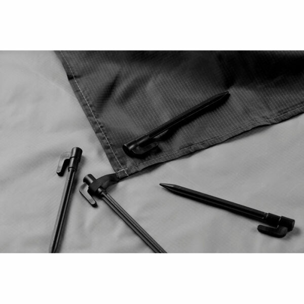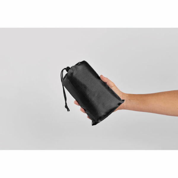 Lichtgewicht strandmat van 210T polyester, afmeting 200x210cm. Inclusief 4 zwarte haken en bijpassende trekkoordzak voor eenvoudig meenemen.