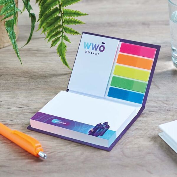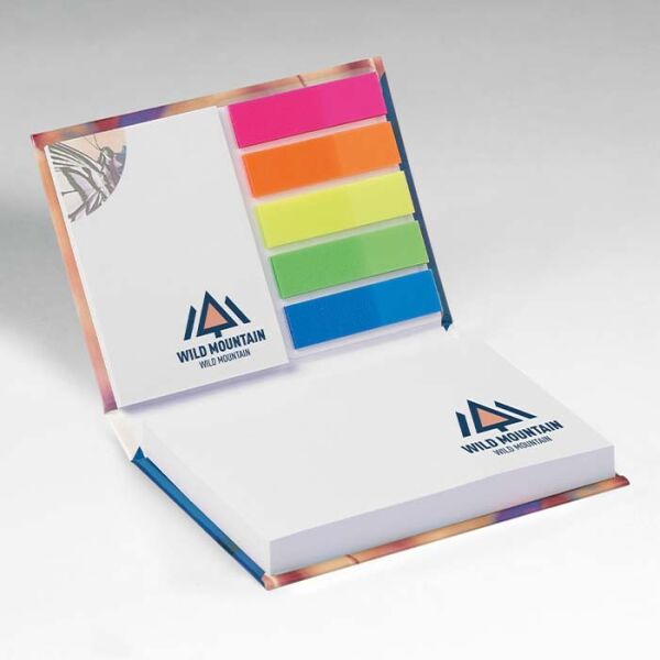 Gelamineerd memoblokje met harde kaft, 125 sticky notes in 2 maten en 20 markers in 5 kleuren.