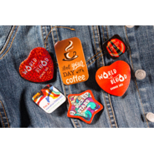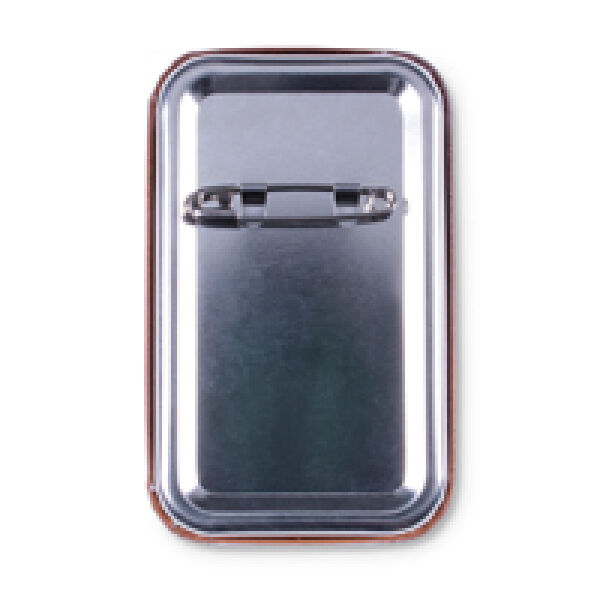 Full color button in rechthoekige vorm met veiligheidsspeld op de achterzijde.