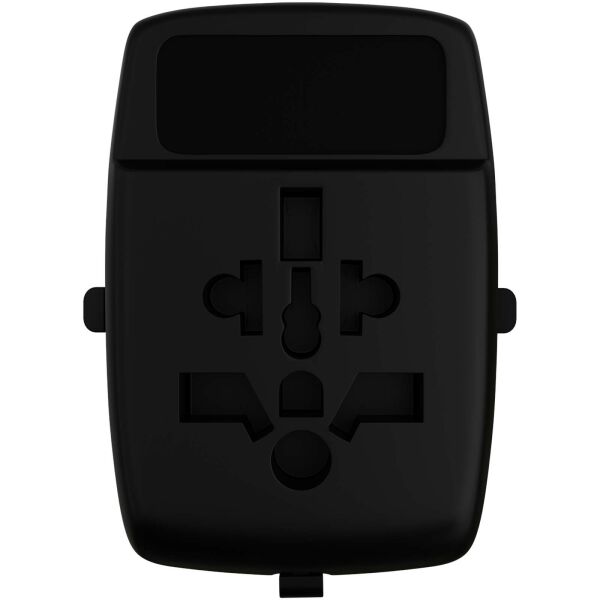 Universele reisadapter met twee USB-A-poorten en twee USB-C-uitgangen, waaronder een ultrasnelle 65W GaN + PD USB-C-poort voor het opladen van laptops. Voorzien van een felgekleurde, rubberen, oplichtende logo-afwerking. Geschikt voor stopcontacten in meer dan 150 landen en geleverd met een luxe PU-reisetui.