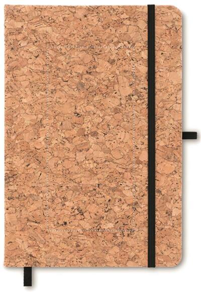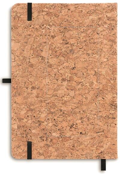 A5 notitieboek met harde kurken kaft. Ingebonden. 192 pagina's gerecycled papier (96 vellen). Elastische sluitingsband, bladwijzer met lint en elastische penhouder. Kurk is een natuurlijk materiaal. Door de structurele aard en de porositeit van het materiaal kan het uiteindelijke drukresultaat per item afwijkingen vertonen.