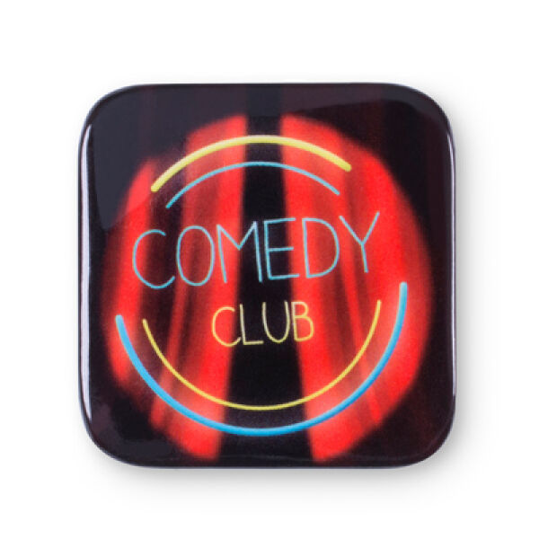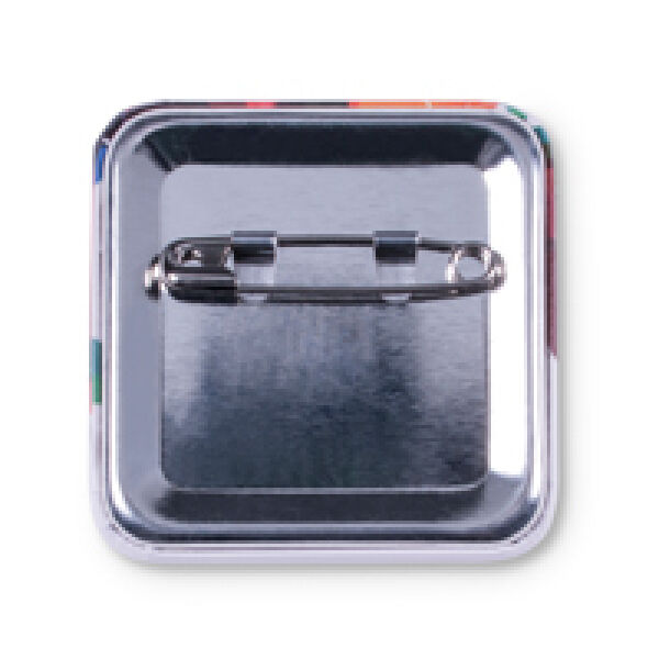 Full color button in vierkante vorm met veiligheidsspeld op de achterzijde.